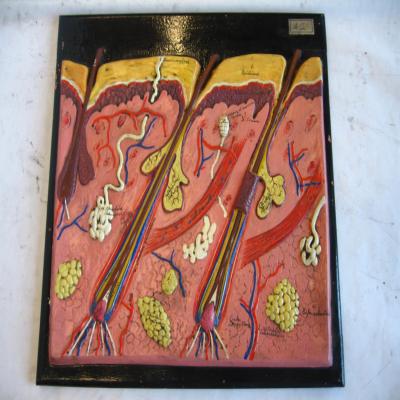 Modelo de anatomía humana. Corte de piel aumentado. Sobre un soporte de madera cuadrado se muestra un modelo de un corte de piel en el que se observa: la epidermis, el estrato Malpighii, el corium, glándulas y poros sudoríferos, glándula sebácea, venas y arteriolas subpapilares, músculos, bulbos y folículos pilosos, las diferentes capas de un pelo (sustancia medular, sustancia cortical…).