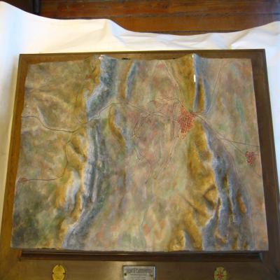 Maqueta geológica en relieve. Muestra la cuenca carbonífera de Puertollano en Ciudad Real. Puertollano se encuentra al suroeste de la provincia de Ciudad Real, en la comunidad autónoma de Castilla-La Mancha. Geográficamente, está ubicado en el Valle del río Ojailén, encajado entre la Sierra de Puertollano y la de Calatrava. Están representadas las dos sierras separadas por una cuenca por la que pasa el río Ojailén. Se observa un pueblo, cerca del rio, al pie de las montañas, que probablemente se trate de Puertollano. Al otro lado de ese cadena montañosa también hay un pueblecito más pequeño.