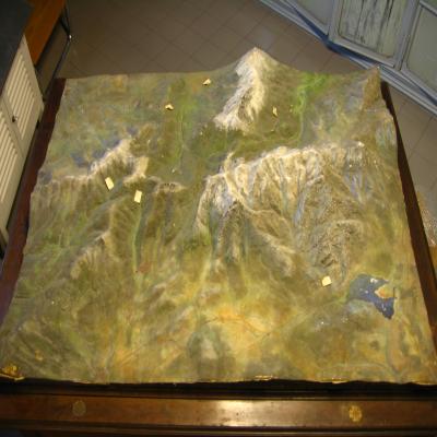 Maqueta geológica en relieve. Grandes dimensiones. Parece representar la zona oeste de la Sierra de Guadarrama. Se diferencia la Granja, Los Molinos, el Puerto de Navacerrada y el de Fuenfría, lo que parece el pico de la Mujer Muerta y la Boca del Asno.