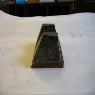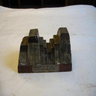 Sobre un soporte de madera. Con una etiqueta antigua pegada en un lateral, con inscripción con bolígrafo: "Esquema de una fosa tectónica (1) y de un horst (2). Cesar ¿Vasa?. 7º curso". Al lado hay una etiqueta suelta, grande, blanca, con inscripción con bolígrafo: "BLOQUES DIAGRAMA DE GEOLOGIA (realizados por alumnos)".