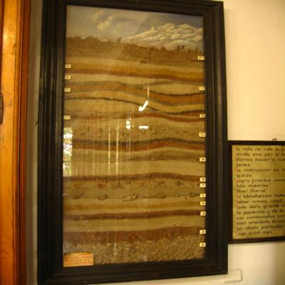 Cuadro de grandes dimensiones colgado en una pared de la sala 1. Representa el perfil de un suelo, en el que se aprecia los diferentes horizontes (hasta 21), y restos tanto biológicos (dientes, hueso..) como intrumentos antiguos (instrumentos prehistóricos..). Se puede observar la textura y composición de las diferentes capas.