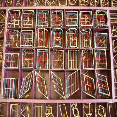 Caja con una numerosa colección de modelos cristalográficos. La caja está dividida en 108 compartimentos donde se sitúa un modelo por compartimento. Hay estructuras piramidales, tetrágonos, prismas, estructuras romboidales, estructuras poligonales. En la parte externa se sitúan dos filas que rodean toda la caja con modelos (un total de 80 modelos) de un solo color (color hueso), y que nunca poseen ejes internos. En el centro del conjunto se sitúan cuatro filas de siete modelos (28 en total), con ejes internos y secundarios de otros colores (azul y rojo) diferentes de los principales (color hueso).