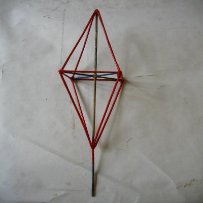 Modelo de forma cristalográfica. Representa una bipirámide rómbica, perteneciente al sistema rómbico. Las aristas externas son rojas, mientras que los ejes internos son de colores (blanco, azul y verde).