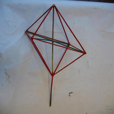 Modelo de forma cristalográfica. Corresponde a una bipirámide, perteneciente al sistema triclínico. Las aristas externas son rojas, mientras que los ejes internos son blanco (la que une los vértices más alejados), verdes y azules.