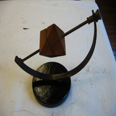 Sobre un soporte de madera, y unido a una vara recta de metal sostenida por otra en forma de media luna. Las dos piezas pueden girar. Sin incripción o identificación alguna.