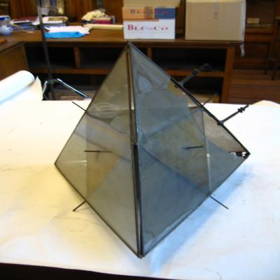 Model cristalográfico. Combinación de octaedro y tetraedro, ambos del sistema cúbico, para deducir los ejes. El tetraedro es externo, de cristal y metal (cristal rotos por varias caras), y el octaedro es interno y metálico. Se pueden observar distintos ejes metálicos que sales del octaedro y sobrepasan el tetraedro.