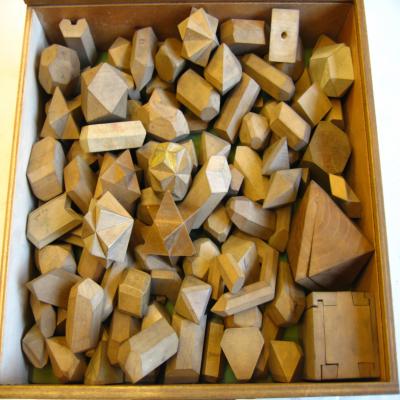 Modelos cristalográficos. Caja con figuras cristalográficas de madera