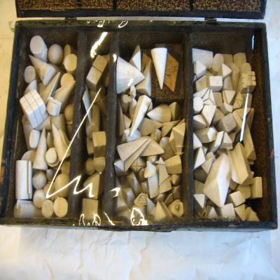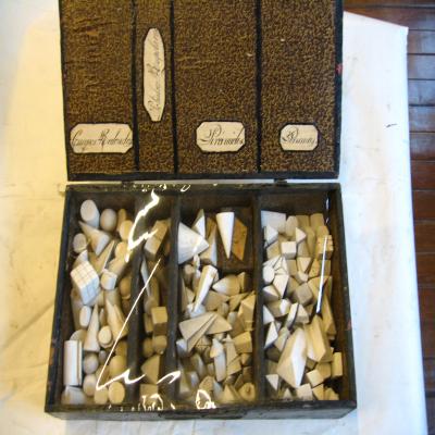 Modelos cristalográficos. Colección de 100 figuras geométricas (según la etiqueta), de diferentes tipos, hechas en escayola por un alumno. Las figuras están dentro de una caja, separadas en cuatro compartimentos, que se suponen que representan cuatro grupos: cuerpos redondos, poliedros regulares, pirámides y prismas. Alguna figura parece haberse descolocado.