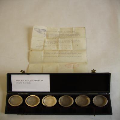 En una caja, con varios compartimentos iguales donde se colocan los diferentes platillos. Lleva una incripción en la tapa: \SOGERESA SUCESOR. R.LLORD. S. MARCOS, 43. MADRID\. Lleva un papel con las instrucciones de la prueba, escritas a máquina, en las que en la parte superior está escrito: \KELVIN-APARATOS CIENTIFICOS. TALLERES: LISTA, 26. MADRID\, \APRECIACION DE GROSORES SEGÚN EL PROFESOR KLEMM\, y en la parte inferior \\SOGERESA\ SUCESOR R.LLORD. SAN MARCOS, 43. Teléf. 23847. Material Cinetífico y Pedagógico\.