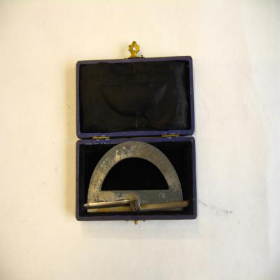 Instrumento. Corresponde a un goniómetro (o transportador). Es un instrumento de medición con forma de semicírculo graduado en grados utilizado para medir o construir ángulos. Tiene un máximo de 180º. Es de metal. En la base posee una especie de aguja doble indicadora, ajustable con un tuerca, para señalar en la escala graduada.