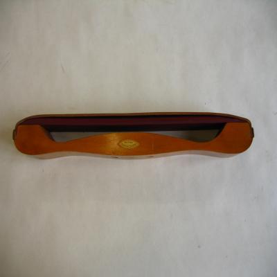 Dentro de un estuche de cartón. La pieza tiene inscrito en la madera, en un lateral \Feinste. Spezial-Juchte\. El estuche tiene otra inscripción con letras doradas: \R.JUNG, A.-G. HEIDELBERG. \MADE IN GERMANY\\.