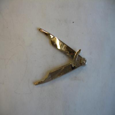 Parece ser un calibre o medidor de ángulos. Es un instrumento de metal formado por dos brazos metálicos unidos por un extremo, y en este extremo una pieza de metal curva reglada, con medidas de 0 a 10, y con una inscripción al lado que dice \D. SIMAL\. Los dos brazos metálicos se pueden mover, de manera que un pequeño indicador señala la medida en la pieza reglada. Los dos brazos poseen una serie de estrías en su cara externa.