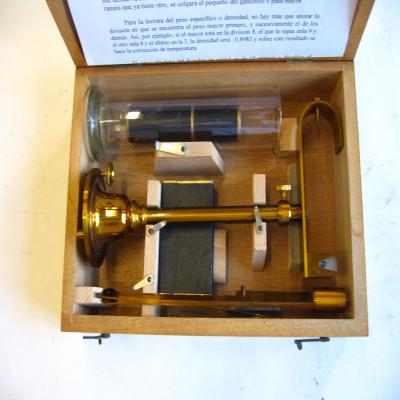 Balanza de pesos específicos Westphal para líquidos. La Balanza Westphal es un equipo que consta de un juego de ganchos, los cuales, colocados correctamente en las ranuras del brazo de la balanza, permiten determinar la gravedad específica de una sustancia a la temperatura que se encuentre. Los ganchos son de distinto tamaño (1, dentro de una caja de cartón). Otras partes de la balanza son: -La base (que se divide en dos partes, 2 y 3) -El brazo basculante con 9 ranuras (4). -La plomada, dentro de la cajita nº1. -El cilindro de cristal para la muestra (5). -Termómetro de inmersión (6) dentro de una cajita con forma de cilindro. -Pinzas de metal (7). También hay un hoja de instrucciones (8), antigua, y una copia moderna.