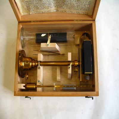 Parece corresponder a una de las dos balanzas de Westphal para pesos específicos líquidos adquiridas por el instituto en el curso académico 1951-52, según la memoria de ese año. Igual que ICC8-EEI-1736. Le falta el termómetro de inmersión, sólo conserva la caja.