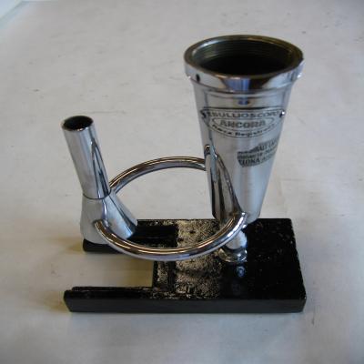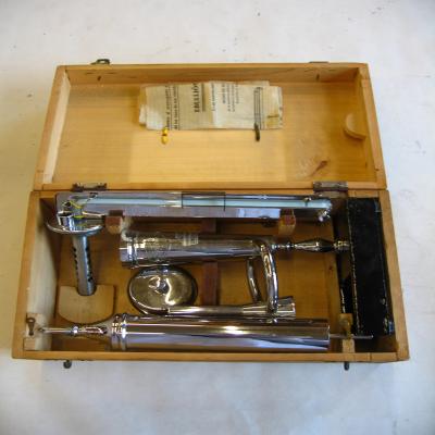 Ebullioscopio. Está basado en el principio de que la mezcla agua-alcohol (como el vino) ebulle a una temperatura bien determinada, más baja que la del agua, según el contenido de alcohol. Consta de varias piezas: 1-Una calderita. 2-Brazo con un termómetro, con escala de 0 a 20. 3-Refrigerador. 4-Mechero. 5-Pipeta de cristal. 6-Instrucciones antiguas.