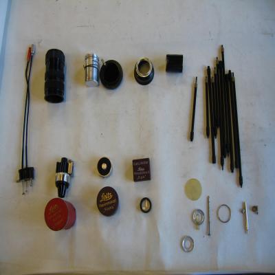 Algunas piezas están dentro de cajitas, con diferentes inscripciones: \Leitz. Universal-sucher \Vidom\\ (Visor universal), \E.Leitz, Westzlar. Leica. Vorsatzlinse 2 \Elpik\\ (lente adicional) y \Leitz. Panoramakopf \Fiama\\ (cabeza panorámica),.
