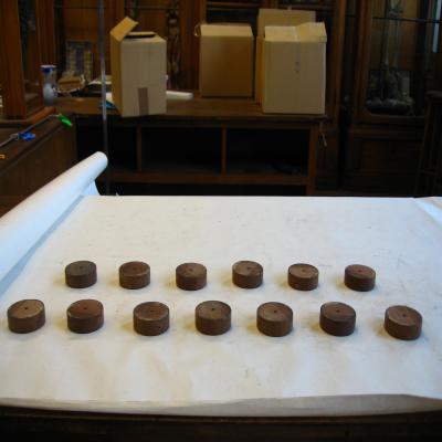 Conjunto de trece discos de madera, pulidos. Todos tienen un agujero en la mitad del disco, que lo transpasa, y otro en un lateral.