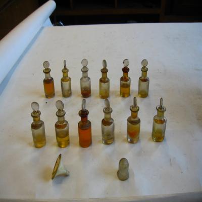 Colección de doce frascos de cristal con esencias en aceite. Algunos aún coservan el aceite y otros o lo han perdido o se ha estropeado. Algunos frascos también conservan una etiqueta con el nombre de la planta o parte de la planta de la que procede el aceite.