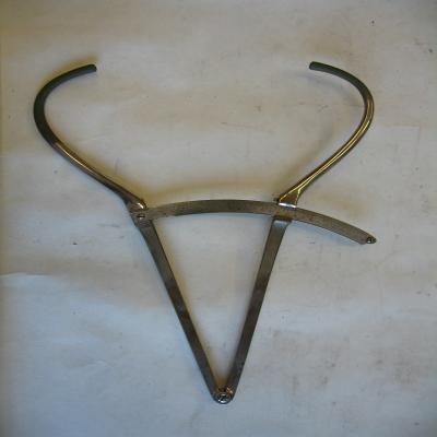 Se trata de un antropómetro o compás curvo para medir grandes diámetros, que por su tamaño probablemente se trate de un compás cefalométrico. Consta de una escala graduada curva y sus ramas (dos) son curvas. La escala graduada está colocada entre las dos ramas, es curvam y se puede mover; una tuerca fija la escala, manteniendo la medida.