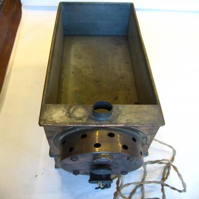 Baño maría para tubos de ensayo. Recipiente metálico de forma rectangular, con cuatro patas y clave unido. Tiene una especie de motor o zona eléctrica en un lado. Además del recipiente encontramos: