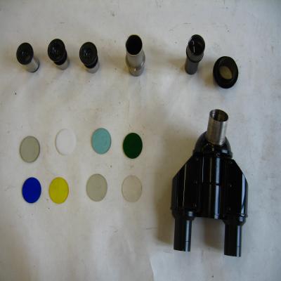 -Otras piezas: Los dos oculares situados en el aparato, y otro a parte, el objetivo situado en el aparato, un tubo donde encaja en objetivo, y otro tubo cilíndrico en la caja, y ocho círculos de cristal de diferentes colores (blanco, ahumado, verde, azul..) y transparencias.