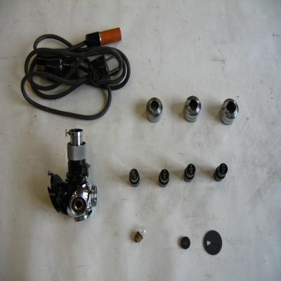 -Por otro lado, en la caja, hay diferentes piezas: las tres cabezuelas donde se colocan los objetivos, el diafragma, una pequeña bombilla como fuente de luz, y cuatro botecitos cilíndricos con los objetivos en su interior, una pieza de metal circular, con agujero en el centro y el cable con el enchufe.