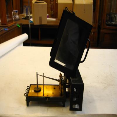 Hidrógrafo antiguo, de cabello. El hidrógrafo es un aparato que registra continuamente la humedad relativa del aire. Está formado por una especie de caja negra con paredes de cristal, dentro una pieza cilíndrica que tiene a su alrededor enrollado papel que tiene registrado los días de la semana. También hay una especie de aguja, para ir marcando el papel. Al funcionar la máquina, el papel va girando, y se va pintando un hidrograma, indicando la humedad del aire. Además de la caja donde se sitúa el hidrograma hay en un lateral lo que es el hidrógrafo propiamente dicho, cubierto por una red metálica rectangular, y donde hay situados unos cabellos de un extremo al otro.