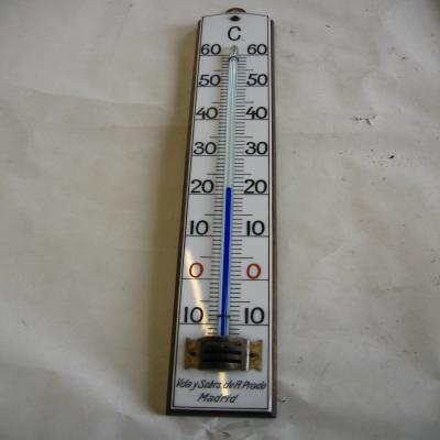 Termómetro moderno de pared. Está formado por una base de madera con aro en la parte superior para poder colgarlo. Sobre la base se dispone una placa de porcelana con la escala (simétrica a cada lado del termómetro, de 10 a 60), y en medio de ella el termómetro, de cristal. El indicador es de color azul. La base del termómetro está protegida por una pieza metálica.