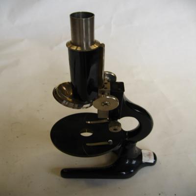 Microscopio alemán. Es de color negro, con un ocular y dos objetivos. Se puede descomponer en las siguientes piezas: -Cuerpo principal (1), donde se disponen el cabezal donde se coloca el ocular, el revólver, la platina, el brazo, las perillas de enfoque y la base. -Dos oculares, uno de 6x (2) y el otro de 20x (3). -Pieza donde se encaja el diafragma (4). -Dos diafragmas (5 y 6). -Dos objetivos, uno de 41,5 6 (7), y el otro de 12.6 3* (8). -Espejo de dos caras (9) y la pieza que lo une al miscrocopio (10)