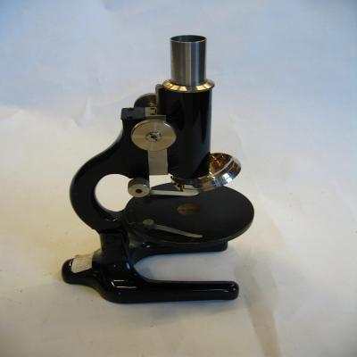 Microscopio alemán. Es de color negro, con un ocular y dos objetivos. Se puede descomponer en las siguientes piezas: -Cuerpo principal (1), donde se disponen el cabezal donde se coloca el ocular, el revólver, la platina, el brazo, las perillas de enfoque y la base. -Dos oculares, uno de 5x (2) y el otro de 10x (3). -Pieza donde se encaja el diafragma (4). -Tres diafragmas (5, 6 y 7), uno de ellos con el agujero más estrecho (7). -Dos objetivos, uno de 41,5 6 (8), y el otro de 12.6 3* (9). -Espejo de dos caras (10) y la pieza que lo une al miscrocopio (11)