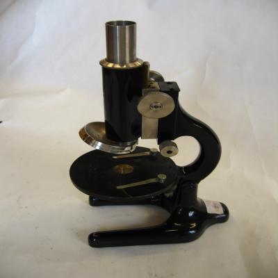 Microscopio alemán. Es de color negro, con un ocular y dos objetivos. Se puede descomponer en las siguientes piezas: