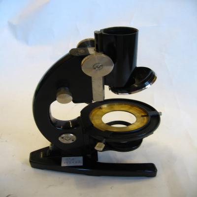 Microscopio alemán. Es de color negro, con un ocular y capacidad para cuatros objetivos. Se puede descomponer en las siguientes piezas: -Cuerpo principal (1), donde se disponen el cabezal donde se coloca el ocular, el revólver, el soporte de la platina, el brazo, las perillas de enfoque y del diafragma y la base. -Cuatro oculares, uno de 15x (2),otro de 12x (3), otro de 6x (4) y el último de 4x (5). -Tubo desplazable donde de encaja el ocular (6), que a su vez se puede desmontar en más piezas. -La platina (7), desplazable en varias direcciones, y con varias escalas y enganches para sujetar el porta. -Diafragma graduable (8), un cristal circular azul (9) y una lente (10), todo de la zona del diafragma. -Cuatro objetivos, uno sin datos (11), otro de 20 0,40 (12), otro de 10 0,30 (13) y el otro de 3 (14). -Espejo de dos caras (15) -Cuatro cajas de metal (16, 17, 18 y 19), cilíndricas, que contenían los objetivos de 20 y 3, y dos cajas de objetivos que no están en el conjunto. -También hay una caja de metal negro (20) llena de piezas y utensilios varios.