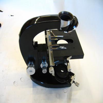 Microscopio alemán. Es de color negro, con un ocular y capacidad para cuatros objetivos. Se puede descomponer en las siguientes piezas: -Cuerpo principal (1), donde se disponen el revólver, la platina, el brazo, las perillas de enfoque y del diafragma, el diafragma y la base. -Un ocular (2). -Tubo donde de encaja el ocular (3), que a su vez se puede desmontar en más piezas. -Tubo (4) que une el ocular con el revólver, de color negro, redondeado en la base. -Dos objetivos, uno de inmersión (1, 12) (pieza nº5), y otro de 5 (pieza nº6). -Lente sobre el diafragama (7). -Otra lente, que se une a la anterior (8). -Espejo de dos caras (9). -También hay una caja de metal negro (10) con varias piezas.