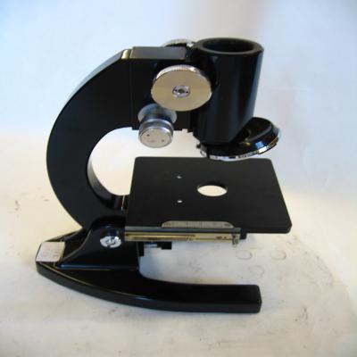 Microscopio. Es de color negro, con un ocular y capacidad para cuatros objetivos. Se puede descomponer en las siguientes piezas: