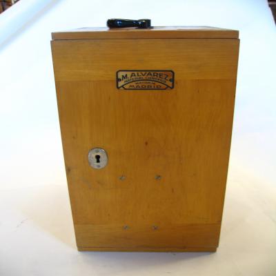 En una caja de madera. Lleva dos etiquetas unidas a la parte superior, con inscripción con bolígrafo: una \Leitz. 308962. Microscopio\, y la otra \Nº19. 308962\. También lleva una placa metálica en la parte delantera, con inscripción \M.ALVAREZ. MATERIAL CIENTÍFICO. MAYOR, 76. MADRID\.
