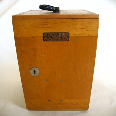 Microscopio dentro de una caja de madera. No se conserva la llave, por lo que no se puede abrir.