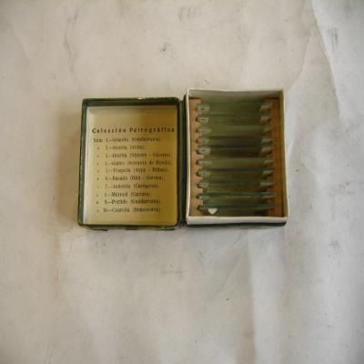 Caja con una colección de 10 preparaciones petrográficas. La caja contiene en la tapa la lista de las preparaciones, diciendo el número y lo que son. Todas las preparaciones tienen su número correspondiente apuntado con bolígrafo.