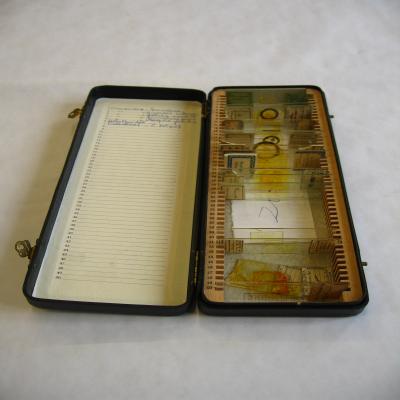 En una caja de color negro, con una etiqueta en la tapa con inscripción con bolígrafo \ZOOLOGIA (antiguas)\. La caja dentro tiene un sello que dice \Industria alemana\. Casi todas las preparaciones tienen una o dos etiquetas con el sello de la casa y los datos. Hay de varias casas, francesa, alemana, del museo de ciencias naturales.. Algunas llevan la fecha: ¿1890?,1902, 1914,1927.