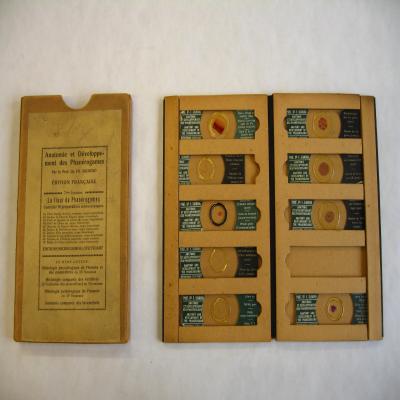 Estuche para 10 preparaciones (hay 9) de la flor de fanerógamas. Cada preparación lleva unidas dos etiquetas, una a cada lado, una con la casa y la colección de la que forma parte, y la otra con el nombre de lo que es. El cubre es redondo, y son preparaciones teñidas.