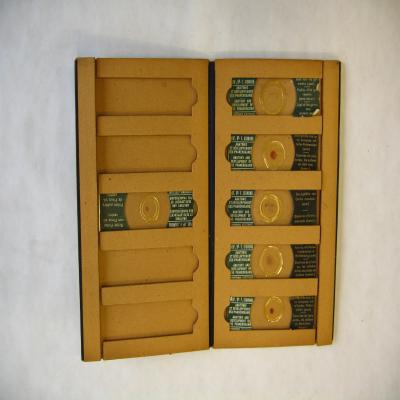 Estuche para 10 preparaciones (hay 6) de la estructura y desarrollo del polen de fanerógamas. Cada preparación lleva unidas dos etiquetas, una a cada lado, una con la casa y la colección de la que forma parte, y la otra con el nombre de lo que es. El cubre es redondo, y son preparaciones teñidas.