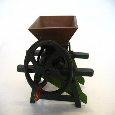Molino. Es un artefacto o máquina que sirve para moler. Es de madera y metal, de colores negro, verde y rojizo. Consiste en un soporte con dos piezas cilíndricas dentadas, que encajan y son las piezas trituradoras. Estas piezas son giradas por medio de una manivela unida a una rueda. Sobre las piezas trituradoras hay una pieza a modo de embudo de perfil cuadrado en la que se deposita el material que se va a moler.
