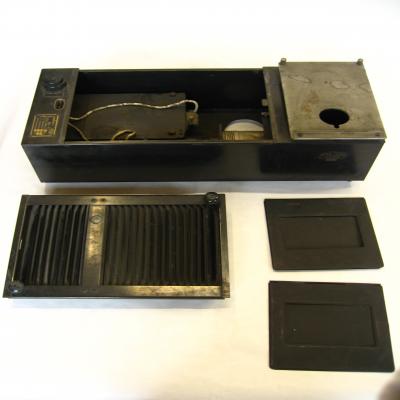 Es un tipo de proyector. Es de metal de color negro. Está formado por una caja rectangular de color negro (pieza nº1), de la que se puede separar una tapa (2) formada por varias rendijas, y a parte hay dos piezas metálicas (3 y 4), de color negro, formadas cada una por dos placas unidas por un lado, y una de ellas con un agujero rectangular.