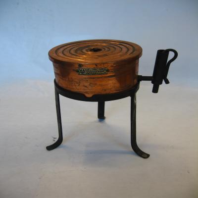 Pequeña caldera, parece de cobre. Está formada por varias piezas: -Un soporte de tres patas de metal (pieza nº1). -El recipiente (2) que lleva unido una especie de grifo. -La "tapa" que está dividida en siete círculos concéntricos que se superponen, desde el más grande (pieza nº3), al más pequeño (9).