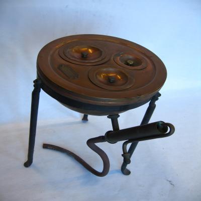 Parece parte de un alambique. Está formado por un soporte de tres patas (pieza nº1), un recipiente redondeado (2), una especie de grifo unido a una pieza curva de goma (3), y la "tapa" formada por seis piezas de diferente tamaño (de la pieza 4 a la 9) , algunas de ellas concéntricas respecto a otras.