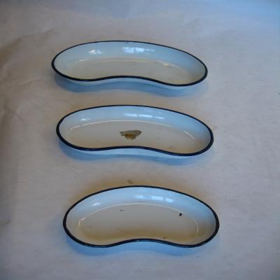 Tres bandejas tipo sanitarias, de diferentes tamaños e igual forma, de manera que cada tamaño más pequeño encaja dentro de la anterior más grande. Tienen forma de riñón, y son blancas con el borde azul.