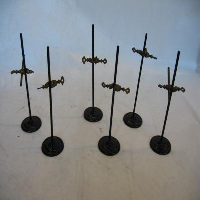 Seis soportes de labotorio de metal de color negro. Están formados por una base de la que sale una vara metálica vertical. Unida a la vara hay una pieza metálica dorada para unir algún tipo de utensilio.
