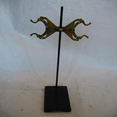 Soporte de laboratorio. Es de metal negro con una pieza dorada. Está formado por dos piezas: