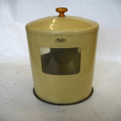 Campana grande, de metal de color beige, y asa de madera. Tiene tres ventanas, dos de ellas cerradas con plástico transparente.
