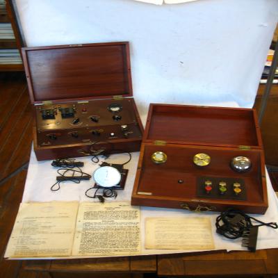 Las dos cajas llevan unidas unas chapitas metálicas con inscripción "-CULTURA-EIMLER-BASANTA-HAASE (S.L.) -MADRID-". El cronoscopio está dentro de una cajita de cartón con inscripción en la tapa con rotulador "FRAGIL". En la esfera pone "KELVIN. MADRID". Las hojas están escritas a máquina. La hoja de instrucciones para el manejo del aparato de reacciones tiene el sello en dos de sus páginas "MATERIAL PEDAGOGICO MODERNO, CULTURA. EIMLER-BASANTA-HAASE. MADRID. MESÓN DE PAÑOS, 6" "Número 11332". La hoja del cronoscopio "MATERIAL CIENTÍFICO DE ENSEÑANZA. CULTURA. EIMLER-BASANTA-HAASE (S.L) MADRID. MESÓN DE PAÑOS, 6. TEL. 224.223 (METRO ÓPERA)" "NÚM. 11306" "CRONOSCOPIO ARSONVAL. Modelo 1948".