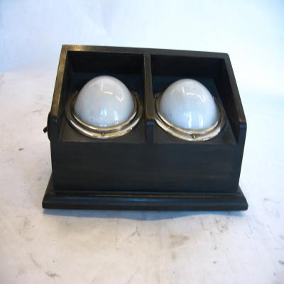 Aparato para el examen de sensibilidad luminosa. Es un aparato que consiste en una especie de caja de madera (pieza nº1), en la que hay dos focos luminosos cuya intensidad luminosa se gradúa a voluntad. En el lado izquierdo hay un enchufe para unirlo al cable eléctrico (pieza nº2) y un interruptor posiblemente de encendido/apagado de un foco. En el lado derecho hay un botón para graduar la intensidad del foco. En la parte posterior está el interruptor de encendido/apagado y el de graduación de la intensidad, posiblemente del otro foco.